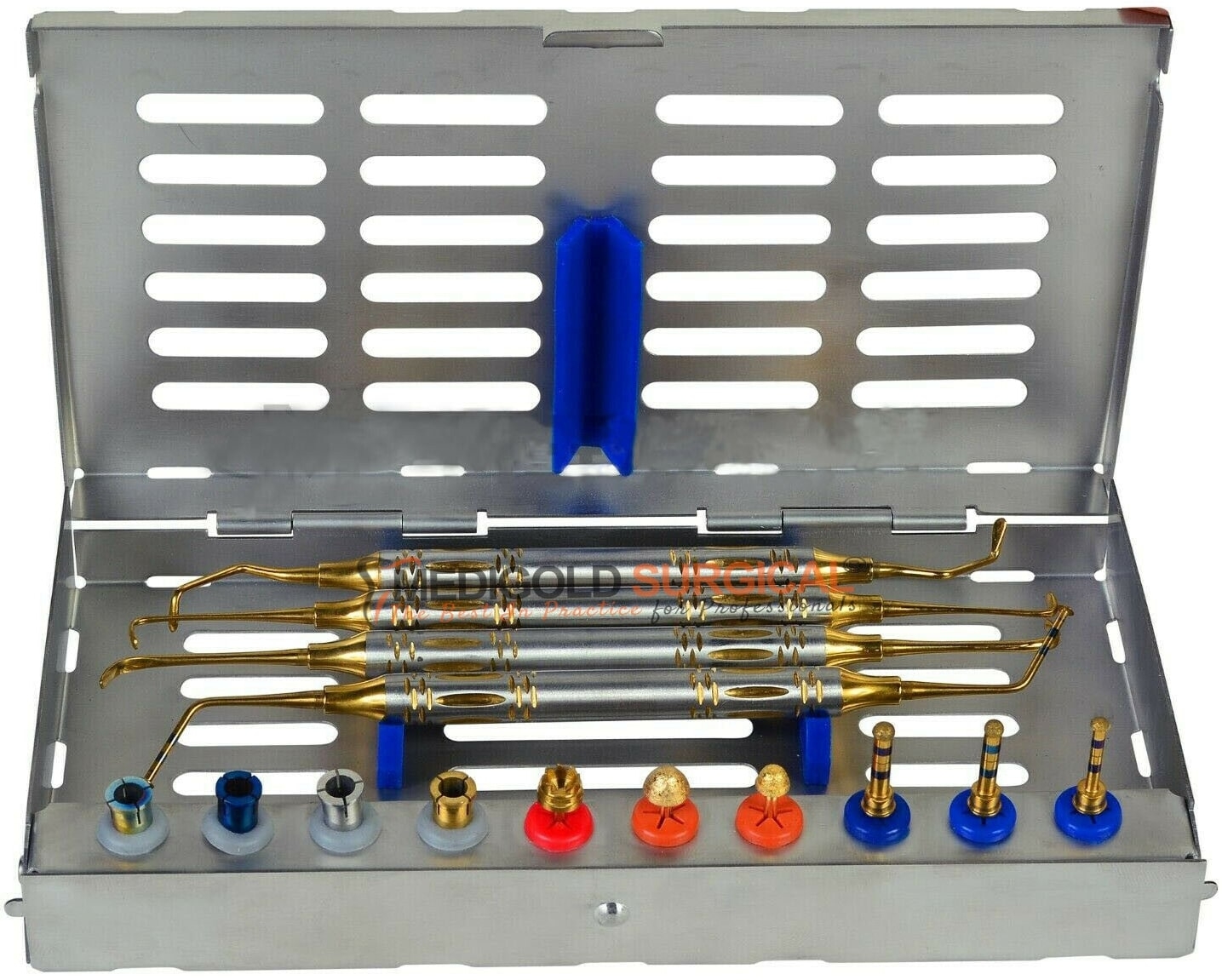Dental Implant Lateral Approach Sinus lift Diamond Burs Drills Stoppers Kit CE. - 4 Pcs Sinus Lift Instruments Golden Titanium Coated Tips - 3 Drills for Crestal Approach Drill# 1: Ø3.3 mm , Marking: (0-2-4-6-8-10-12) Drill# 2: Ø3.7 mm, Marking: (0-2-4-6-8-10-12) Drill# 3: Ø3.3 mm, Marking: (0-1-4-6-8-10-12) - 2 Dental Lateral Approach Diamond Burs Ø0.6 mm Ø0.8 mm Note: Drill speed 800 to 1,200rpm, 30~45N∙cm with irrigation - 1 Window Trephinated Bur Ø0.8 mm ​- 4 Stoppers ​Drilling Depth: 08, 06, 04, 02 ​ Size: L 10.6 mm, Ø5.14 mm L 12.6 mm, Ø5.14 mm ​ L 14.6 mm, Ø5.14 mm ​ L 18.6 mm, Ø5.14 mm
