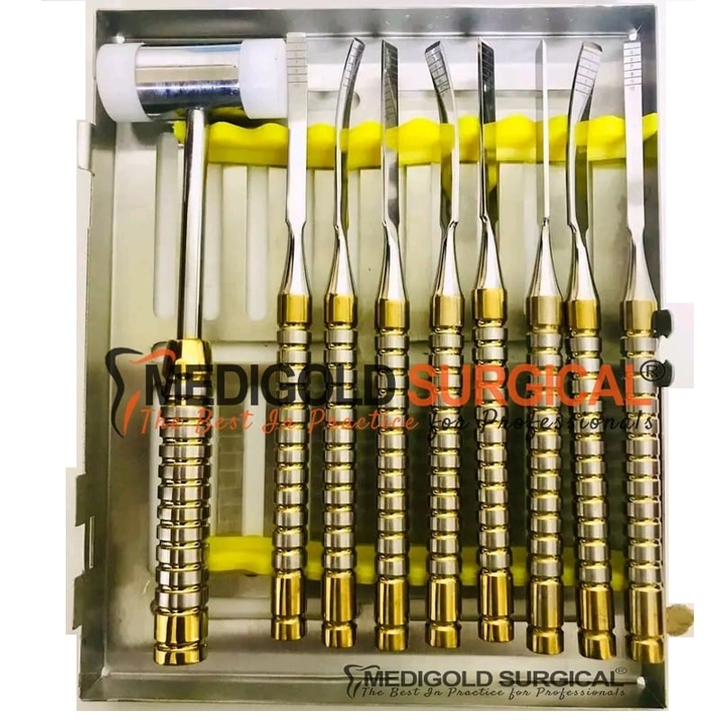 Dental Chisel Set 9Pcs For Bone Splitting With Mead Mallet Gold Coated Dental Implant Set