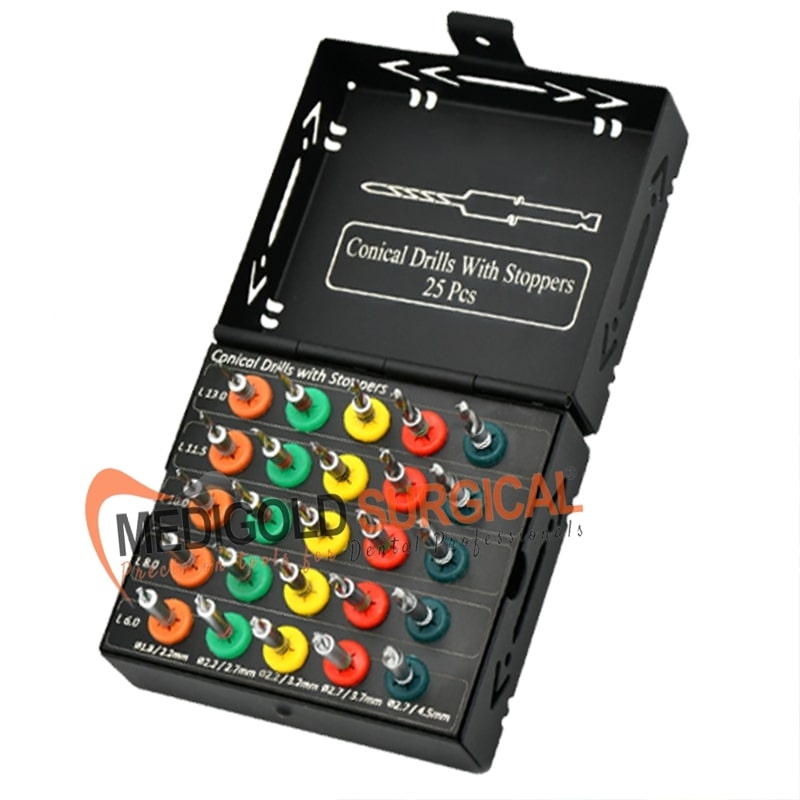 Dental Implant Conical Drills Surgical Black Kit 25 Pcs Include with Stopper kit. Drill Sizes: 1.8 /2.2 mm, 2.2 /2.7 mm, 2.2 /3.2 mm, 2.7 /3.7 mm, 2.7 /4.5 mm Stopper Sizes: L6.0, L8.0, L10.0, L11.5, L13.0 Overall Drill length: 13.0mm (35mm with Shaft) All Instruments conforms to ISO 13485 & CE Certified